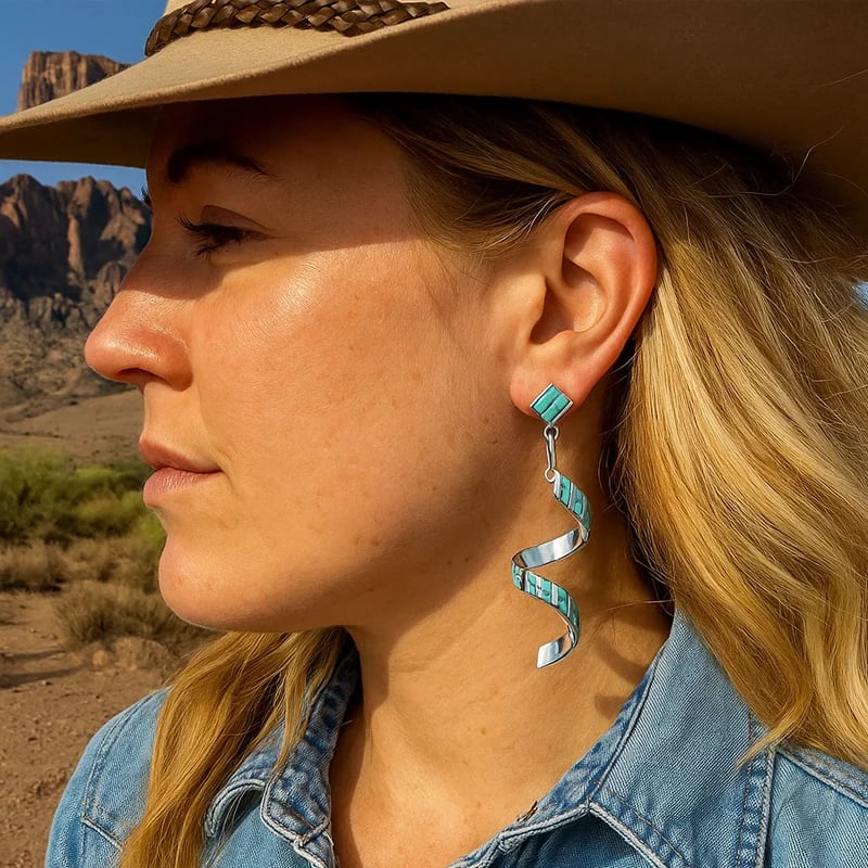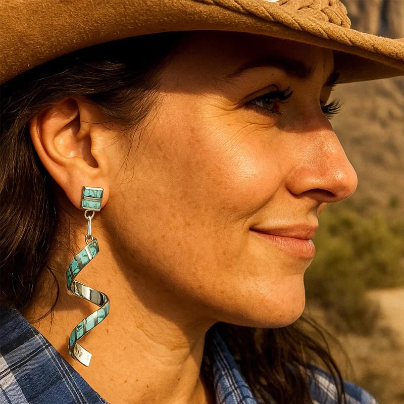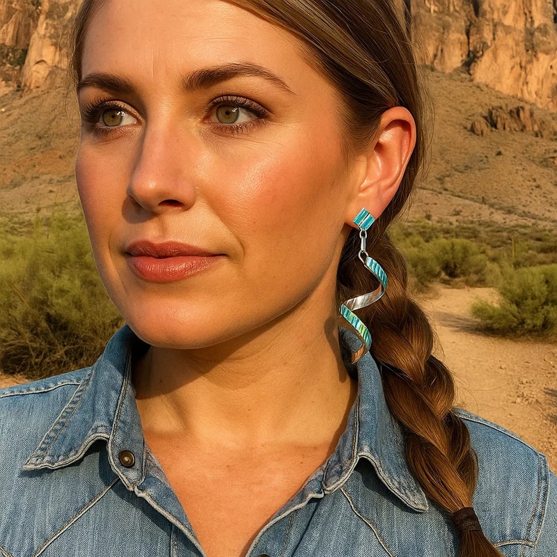 These earrings aren’t just accessories — they’re a journey. A swirl of turquoise and silver, inspired by the infinite twists of desert trails and the sacred stillness of the American Southwest.