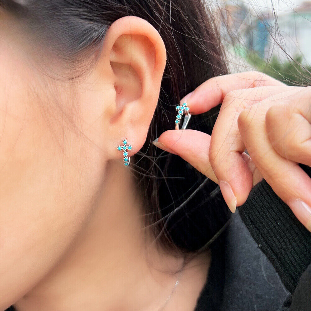 Elevate your style with the 925 Sterling Silver Sacred Cross Earrings, a beautiful product that blends timeless elegance with a touch of spiritual significance. These 925 sterling silver hoop earrings feature an intricate cross pattern inlaid with vibrant turquoise, adding a pop of color and symbolism to your look.Â